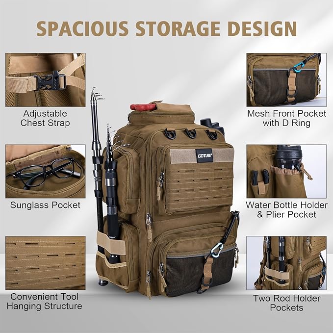 Goture Fishing Backpack,900D Water-Resistant Tackle Backpack with Rod Holders,45L Large Fishing Bag Storage Gear Tackle Bag with Rain Cover,Bottle Holder for Travel Camping Hiking(Without Tackle Box)