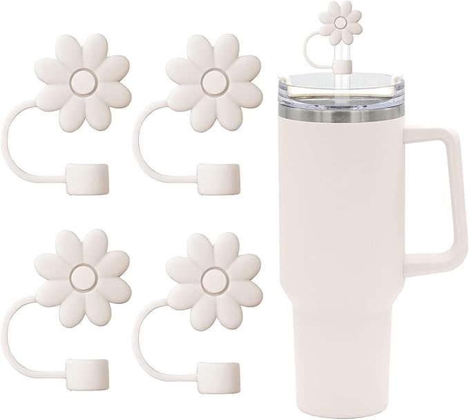 4PCS Silicone Straw Covers Toppers for Stanley Cups 30&40 Oz Tumbler Accessories Flower Straw Caps Cream Dust-Proof Reusable Straws Tips Protectors for Stanley Cup 10mm 0.4in Straws