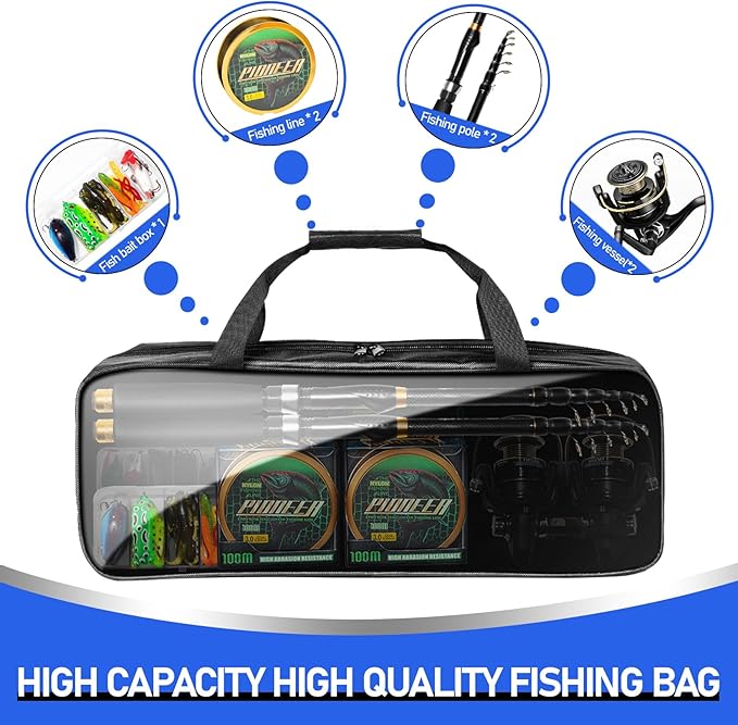 - Complete Fishing Kit for All Levels: Includes 2x 6.9ft Carbon Fiber Rods, 2x 3000 Spinning Reels, 2x 3# Fishing Line Spools (100m each), 1x Tackle Box (40+ Lures & Hooks), and 1x Heavy-Duty Carrier Bag