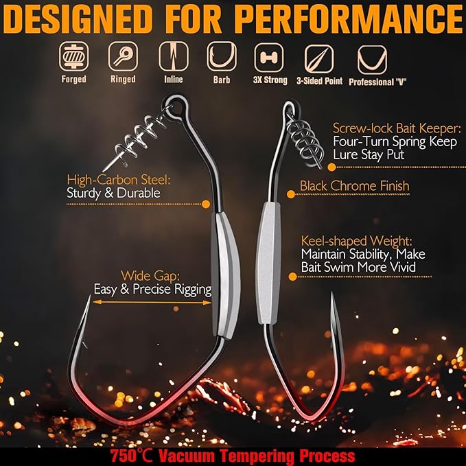 - Designed For Performance: Made of high carbon steel and forged using a unique tempering process. So weighted swimbait hooks are extremely strong. Chemically sharpened 3-sided point is super sharp, lightning-fast penetration. 3X-strong to reduce flex for heavy hooksets. The Black nickel finish enhances corrosion-resistant and powerful. These fishing hooks aren't just out to catch fish. But are out to win!