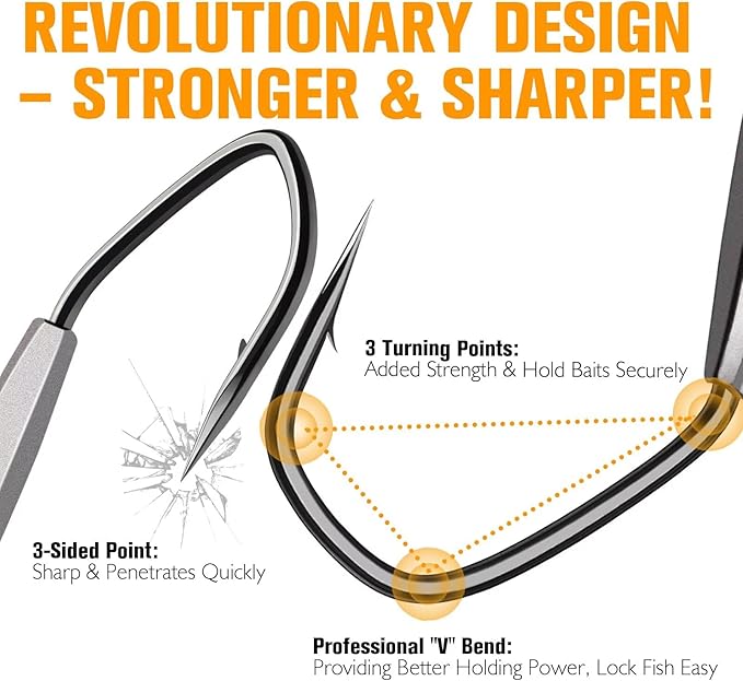 - Revolutionary Design – Stronger & Sharper: Innovative Professional "V" bend design of weighted hook a rock-solid grip on every catch, boosting your hook-up ratio and keeping baits securely in place. 3 Turning Points make the hook bend into a triangle. Added strength of the fishing hook. Strong enough to handle heavy predators such as bass, tuna, catfish, trout, muskies etc. DOVESUN swimbait hook gives big fish chasers a dependable rigging option!