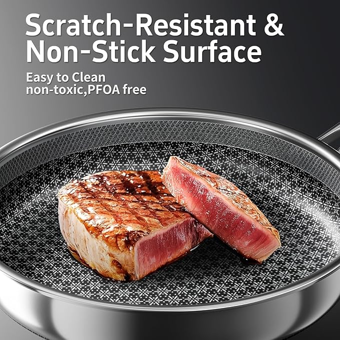 - 5 Ply Premium Stainless Steel: pots and pans ensure rapid and even heating due to 5-layer stainless steel construction with aluminum core, rust-resistant and corrosion-proof for lifelong use; PFOA-free non-stick surface and 304 food grade stainless steel interior for non-toxic and healthy cooking