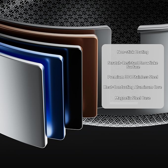 - 5 Ply Premium Stainless Steel: pots and pans ensure rapid and even heating due to 5-layer stainless steel construction with aluminum core, rust-resistant and corrosion-proof for lifelong use; PFOA-free non-stick surface and 304 food grade stainless steel interior for non-toxic and healthy cooking