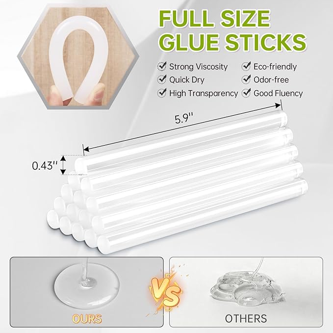 - 【Complete Kit, Ready to Use】 Everything you need in one box: 1 large dual-temp glue gun (59-inch cord), 15 full-size (7/16") low-odor glue sticks, and 1 silicone pads. Start your projects right away!