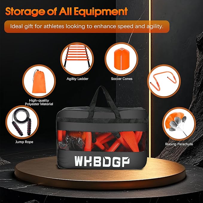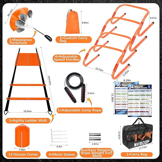 - Complete Football Training Equipment Kit - Kids agility training equipment set includes a 20-foot agility ladder with 12 adjustable rungs and 4 durable stakes, 4 adjustable-height agility hurdles, 12 disc cones and a running resistance parachute with release belt,1 jump rope,1 paper drills guide,1 carry bag. Perfect for beginners, athletes, and fitness enthusiasts, this soccer equipment for training helps improve speed, coordination, and endurance for football, baseball, basketball and more.