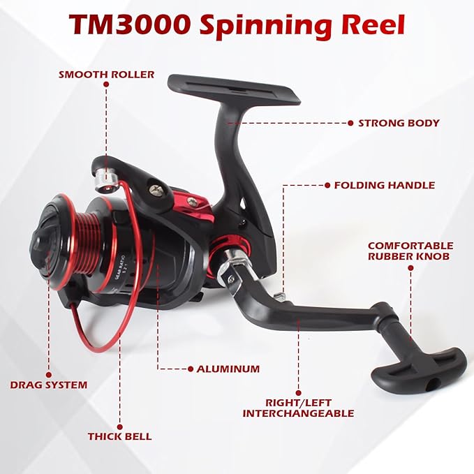 - Powerful TM3000 Spinning Reels: The spinning fishing featuring a folding design, metal handles, and a more comfortable handshake. Ratio 5.2:1. The left handle and right handle is interchangeable for different user habits.