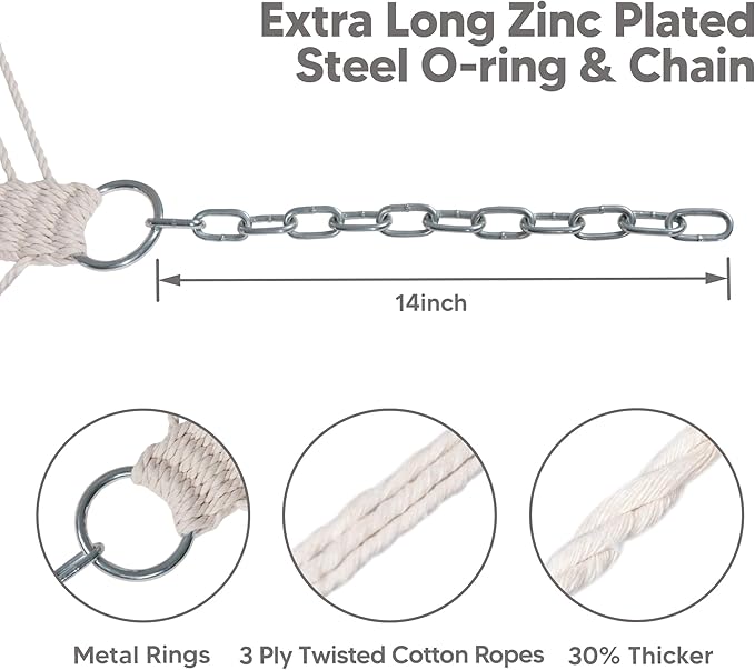 - Upgraded 30% Thicker Ropes: The upgraded strong poly-cotton ropes are hand-woven with comfortable, long-lasting threads woven by the hammock artisans, 30% thicker than before. The 20 ropes are collected together and woven into a triangle pattern which is pleasing to the eye. O-shaped steel ring attaches the ropes and the chain