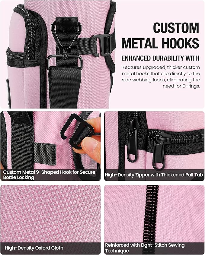 - Premium Adjustable Strap and Closure System:Enjoy enhanced comfort with a widened 1.5-inch adjustable strap (length up to 60 inches). The upgraded 9-shaped metal hook closure adds a premium feel, offering better stability and locking the bottle securely in place.