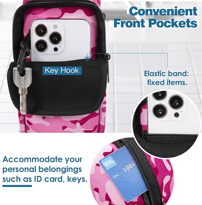 - 2 POCKETS: The small zipper pocket is for cash and card, the large zipper pocket is for smartphone, keys, and other essentials. When you go out, you just need to bring this water bottle bag, no need to carry the bag to hold these small items.