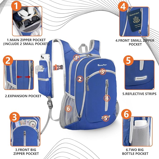 - 10 POCKETS AND PARTITIONS: Stay organized anytime, anywhere! This lightweight foldable backpack has 10 pockets, including 1 main zipper pocket with 2 inner pockets, 1 large front pocket, 1 small front pocket, 2 water bottle pockets, 1 dedicated phone pocket, 1 snack storage pocket and 1 headphone pocket. There are also reflective strips on the adjustable chest strap to hang sunglasses.