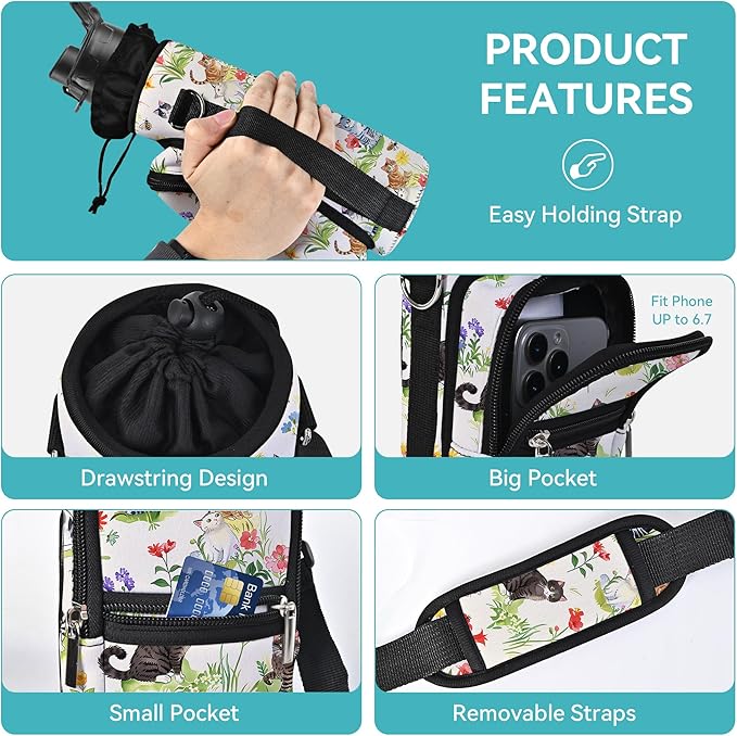 25/32/40/64oz Water Bottle Bag Holder Carrier-Insulated Crossbody Sling Case Sleeve with Strap & Pockets for Men Women Gym Cycling Travel Walking Hiking Camping