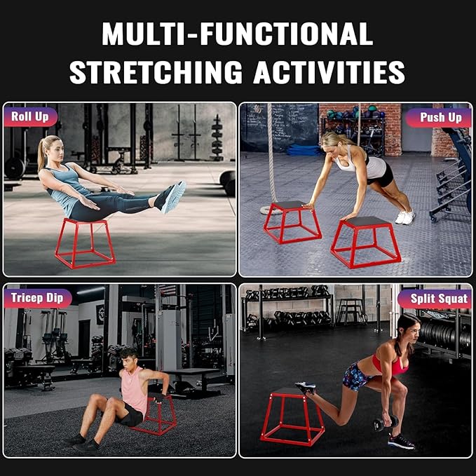 - Durable and Stable: This heavy-duty plyo box features a sturdy trapezoidal steel frame with welded joints for maximum stability during intense workouts. Its 500-pound weight capacity handles demanding plyometric exercises, while the powder-coated finish resists rust, scratches, and wear. The wide platform provides secure landings for box jumps and step-ups.