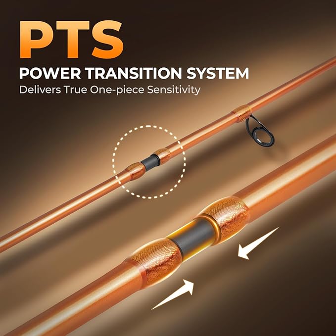 - High Sensitivity 2-piece Fishing Rod – Premium KastFlex IM6 graphite blanks give exceptional bite detection for bass fishing, trout fishing, walleye fishing, and more. The Power Transition System (PTS) delivers the seamless sensitivity of a one-piece rod with the convenience of a 2-piece design for easy transport. Includes extra matching tip section for backup.