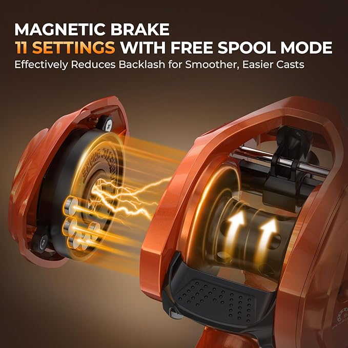 - Baitcasting Combo with Speed & Control – Low-profile Palm Perfect 41mm KastKing Lethal Blaze Baitcasting Reel with a 7.3:1 gear ratio for quick lure retrieval or working slower baits. Features 5+1 MaxiDur double-shielded stainless steel ball bearings, precision brass main gear, magnesium brass pinion gear, and an 11-setting magnetic braking system for smooth casting control. It also includes a convenient line indicator to help you monitor your spooled line weight.