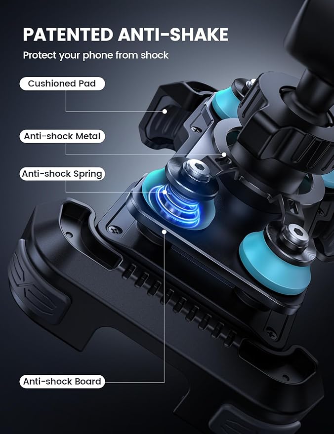 - 【 Patent Anti Shake】 The motorcycle phone mount equipped with patented vibration dampener, effectively reducing the vibration generated when the engine is running at high speed. The four damping springs on the metal board can effectively absorb vibrations, protecting your phone camera from being damaged.