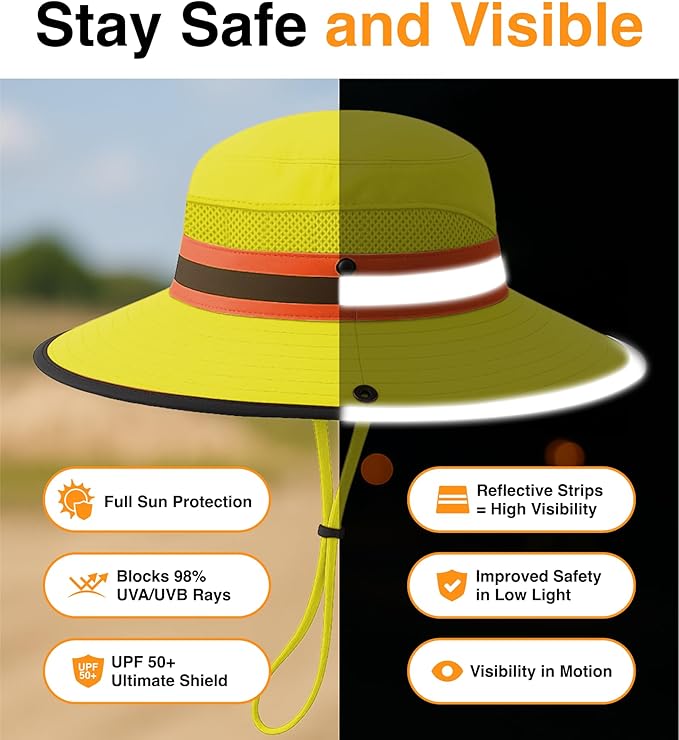 - High Visibility: The sun hats for men and women has bright reflective strips that ensure maximum visibility in low-light and high-risk environments, day or night