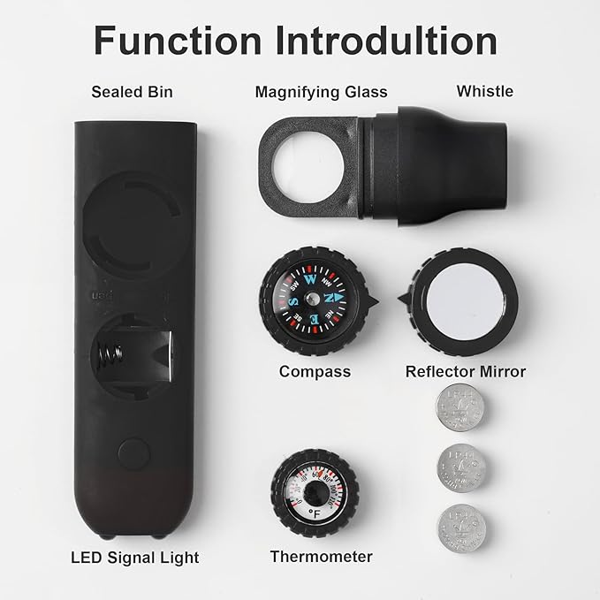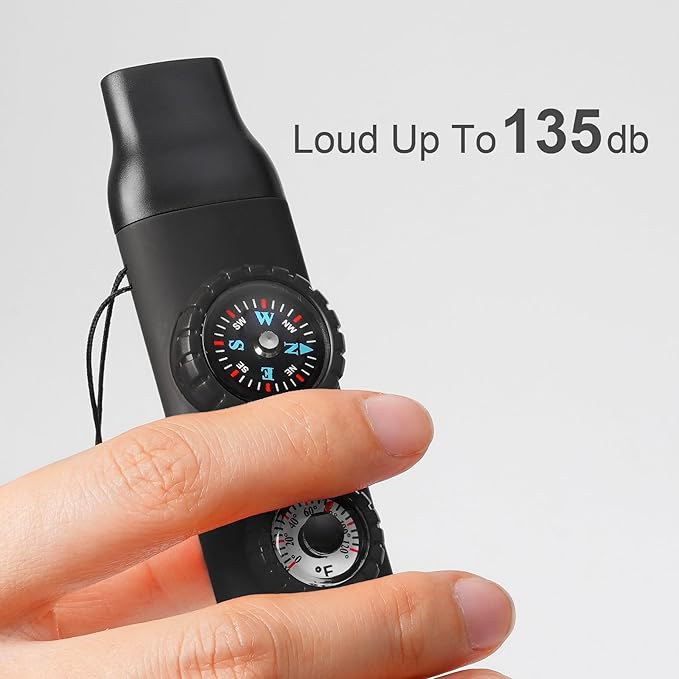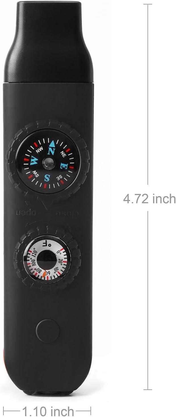 - The 7-in-1 Safety Whistle sets 7 functions including Emergency Whistle, Compass, Thermometer, LED Signal Light, Magnifying Glass, Reflector and Sealed Warehouse with good playability (The uniquely designed miniature built-in storage bin can be used to store important personal information, allowing rescuers to grasp your situation at the first time) (NOTE: If you need help in an emergency, you can try whistling softly, which is louder than whistling at full force)