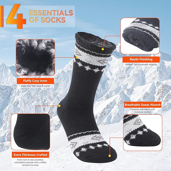 - 4 Pack Thermal Socks Keep Feet Warm & Toasty: Sunew thermal socks are thick warm socks for cold weather, 7x times warmer than cotton that interior is lined with plush brushed fleece makes cozy and soft on our feet. Cold weather thermal socks with padded comfort provide good insulation, creates vacuum of warm air next to the skin. Keeps feet warmer for longer. Specially designed to keep your feet warm even when the temperature outside is way too low; They are softer than wool. No More Cold Feet!