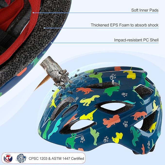 - Security Certification & Effective Protection: This toddler bike helmet are made of hard PC outer shell and thickened EPS liner, which meets the CPC and CPSC standards and fits children's head shape and provides maximum cushioning support. This helmet provides safe head protection for children's activities and the removable machine washable design is easy to clean.