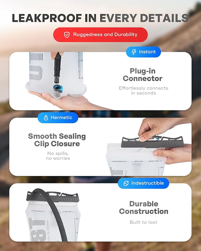 - Extremely Durable: The 1.5L hydration bladder is made of thick TPU, strong and lightweight. It has a wide opening with a sliding lock, quick-release tube connector, and a center baffle to keep it flat and stable, even at high speeds. Smart and sporty design