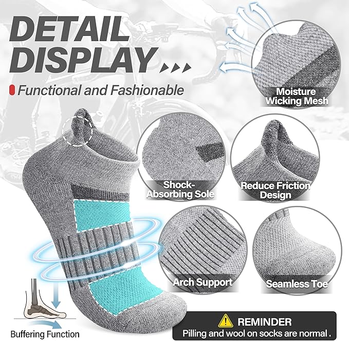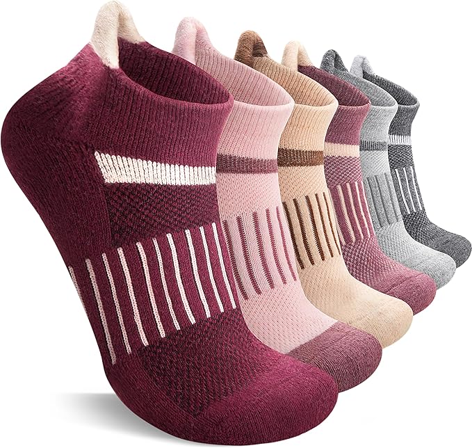 • PROTECTION FOR FEET - These womens wool running ankle socks have stretchy cuff and arch support, which can have great compression support to reduce fatigue, protect the Achilles tendon, improve the blood circulation, and keep socks fit snugly. Cushioned sole absorbs shock and reduces risk of blistering. Pull tab resist abrasion and prevent slipping. All of these provide more protection for your feet.