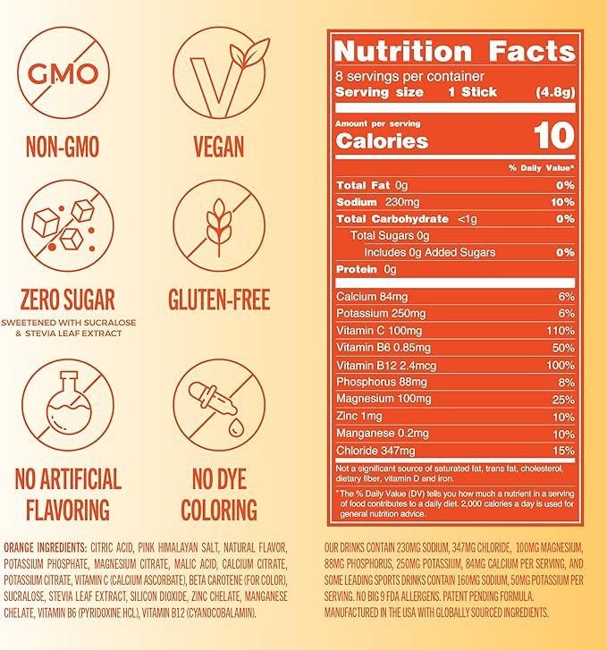 - All the Good Stuff and Zero Sugar: Each stick is filled with 3x electrolytes vs traditional sports drinks - Sodium, Potassium, Magnesium, Vitamin C, Pink Himalayan Salt - all while being Sugar Free, Non-GMO, Allergen Free, Vegan, with No Artificial Preservatives and No Artificial Coloring