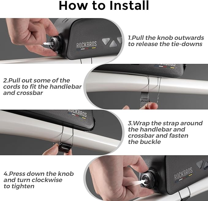 - Easy to Install: The ROCKBROS top tube bag adopts a self-developed innovative installation method, equipped with a sturdy and enduring knob and high-strength binding rope. Simply pull to release, wrap around, and press to tighten for quick, secure and firm fixing without looseness.It fits most bike types including road bikes and mountain bikes, but is not suitable for folding bikes.