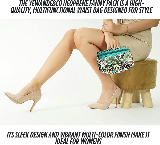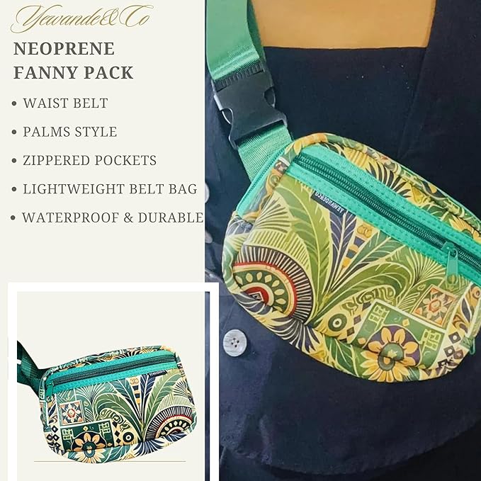 Yewande&co Neoprene Fanny Pack Belt Bag – Lightweight Waterproof Waist Bag with Adjustable Strap, 3 Zippered Pockets, Crossbody Belt Bag for Travel, African Design Crossbody Bags (Palms)