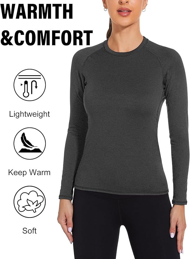 Womens Thermal Compression Long Sleeve Shirts Fleece Lined Tops Crew Neck Slim Fit Base Layer Ladies Underwear