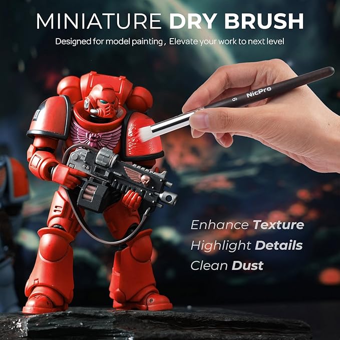 - 【Precision Sable Tips & High-Impact Dry Brushes】Kolinsky sable bristles form an ultra-fine point, hold paint well and release it smoothly for eyes, lines, edge highlights and tiny features. The goat-hair dry brushes quickly pick up pigment and softly catch raised textures on rocks, armor, fur, cloaks and bases.