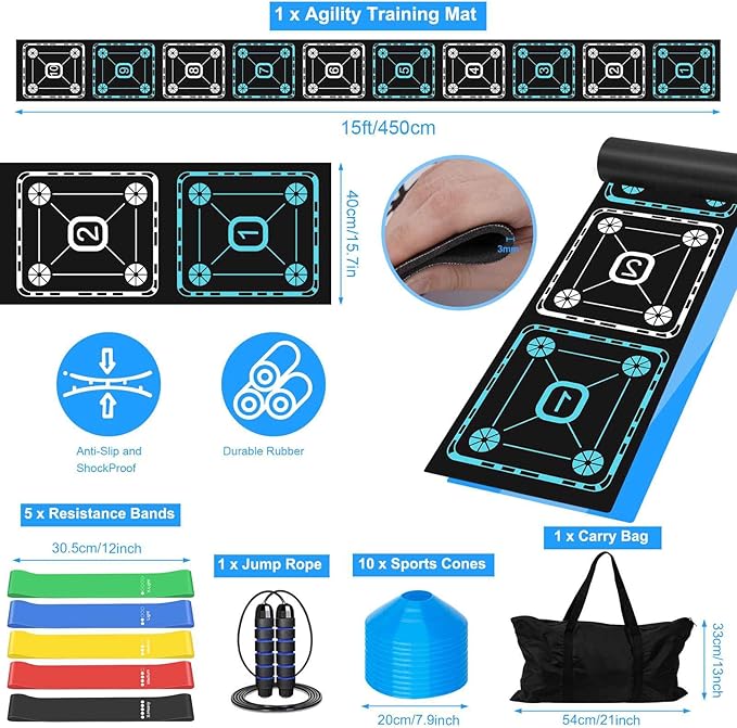 - Ultimate All-in-One Training Kit: One practice equipment set included a 15ft training ladder for footwork, 5 resistance bands for strength, a speed jump rope for cardio, marker discs for drills, and a convenient carry bag.
