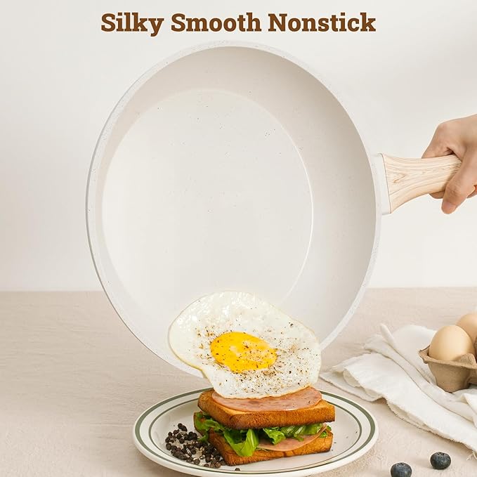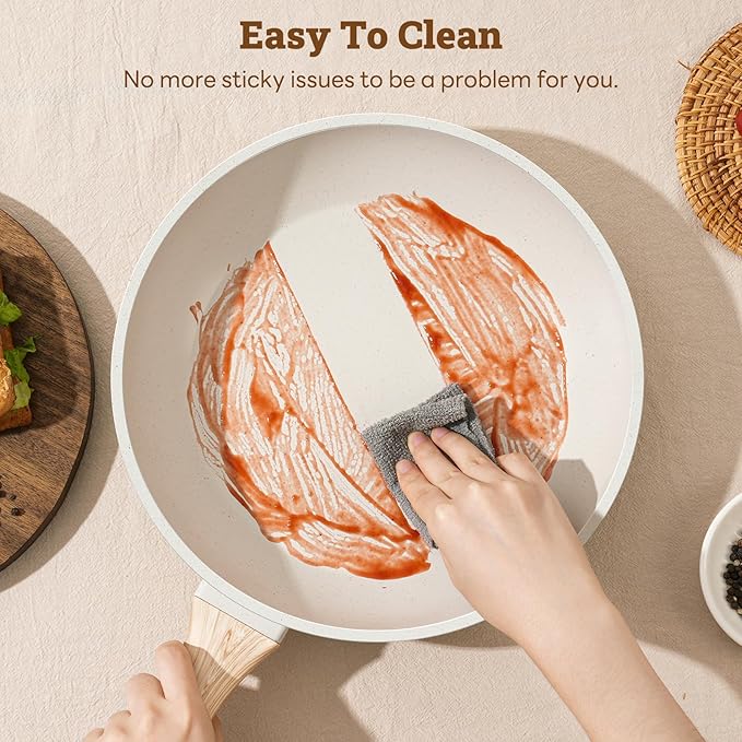 - Hassle-Free Maintenance: Ultra-smooth non-stick surface removes food residue, gently wipe the granite cookware set or simply rinse for quick cleanup, saving time and effort.