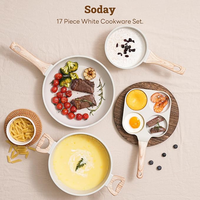 - Complete Cooking Solution: SODAY's 17-piece kitchen cookware set includes a 9.5-inch/11-inch pan, 11-inch/4.3-quart sauté pan, 4-cup egg pan, 1.6-quart saucepan with lid, 4.5-quart saucepan with lid and steamer, as well as 4 Pan Protector with silicone Spatula 、 Spoon and Tong that are ideal for your everyday cooking.