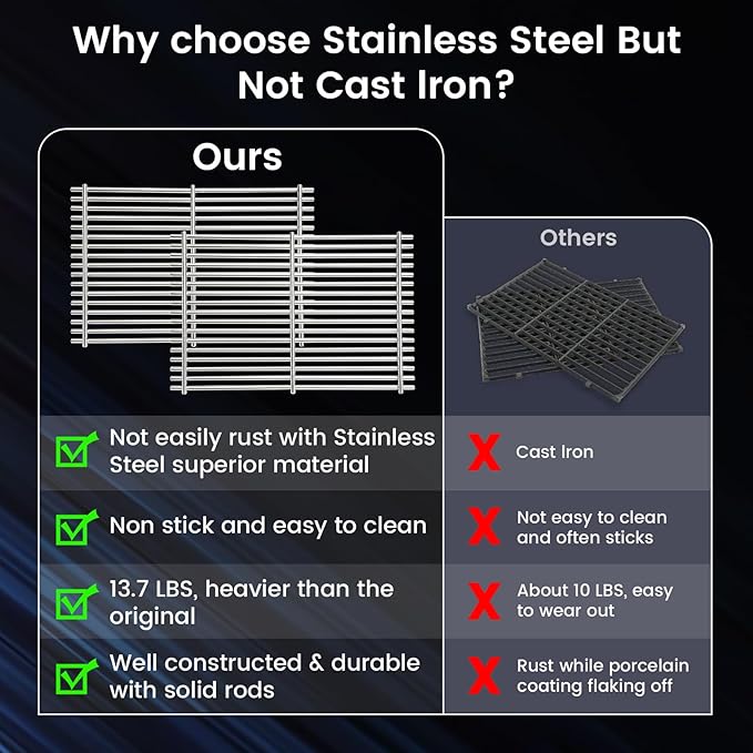 - 【Pro-Grade Performance】 Reinforced welds & polished edges for safe handling. Heavier (13.7 lbs total) than original Weber grates for enhanced stability and perfect sear marks every time.