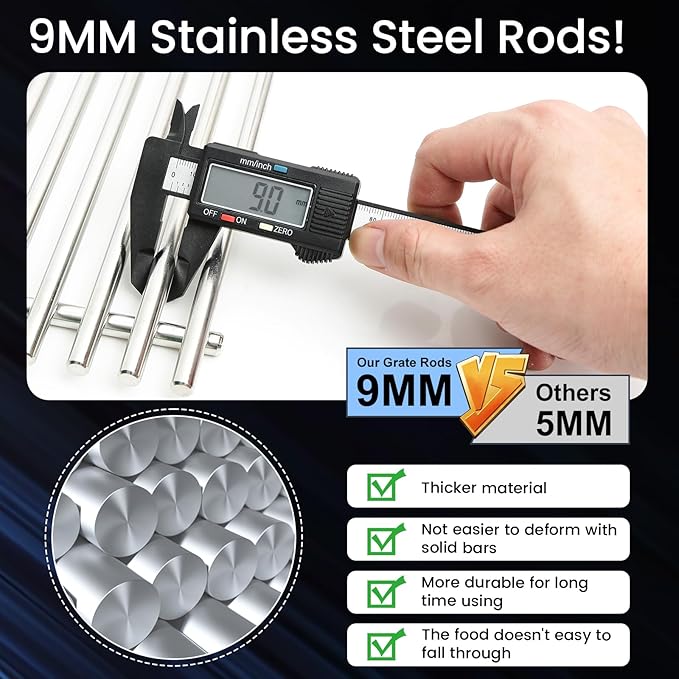 - 【Premium Stainless Steel】Food-grade 9mm thick rods resist warping and corrosion while delivering even heat distribution for perfect grill marks every time