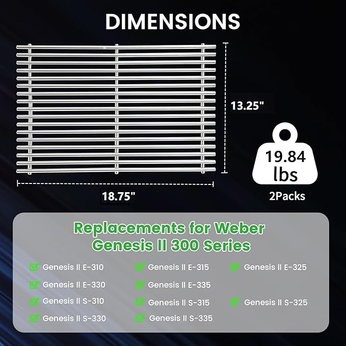 J&YNBBQ Grill Grates Replacement for Weber Genesis II 300 & Genesis II LX 300 Series - 18.75" Stainless Steel Cooking Grid (2 Pack) Fits Models E-310 S-335 CSE-340, Replaces Weber 66095 66805