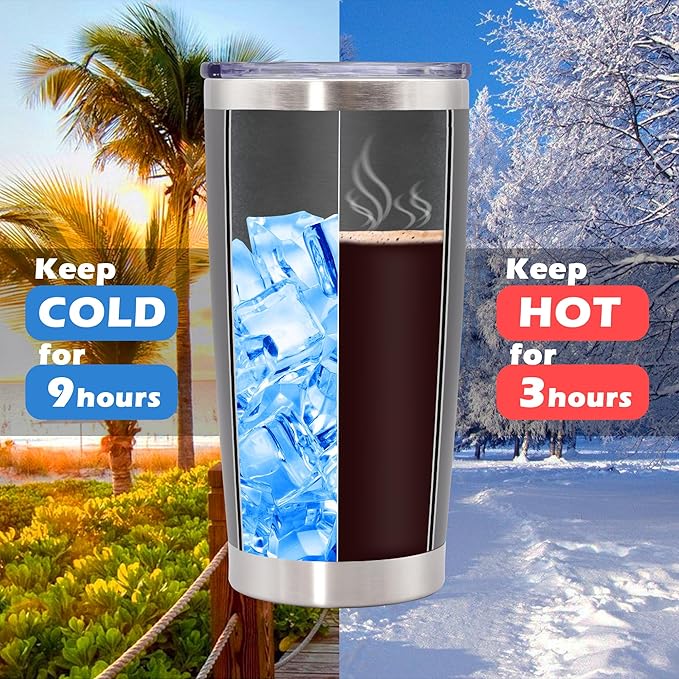 - 【 DOUBLE-WALL VACUUM TUMBLERS 】- Our 20oz tumbler mugs are made of Food Grade 304 18/8 Stainless Steel. The tumblers are with Double-Walled vacuum insulation design, which can keep your on-the-go beverages hot for 3+ hours and cold for 9+ hours. And our tumblers can fit most of the car cup holders. Enjoy your drink for a long time!