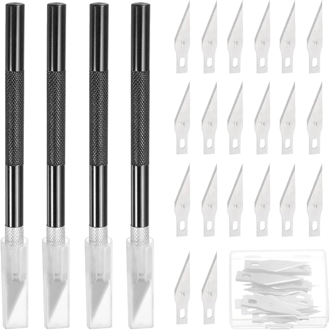 - Color: Black; Material: Carbon Steel, Aluminum; Total Length: 14cm / 5.51 Inch; Exacto Blades: Number 11; In the package of: 4 Pcs Craft Hobby Knife, 40 Exacto Blades