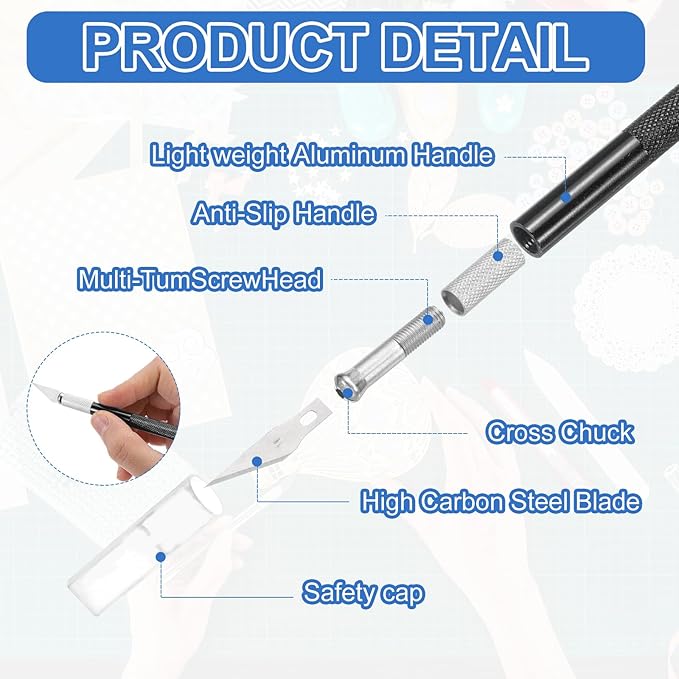 - Each hobby knife is made of durable and lightweight aluminum, with blades constructed from high-strength carbon steel for ease of use. Featuring an anti-slip handle design, it ensures comfort even during extended use, enhancing your crafting experience. The sharpness and durability of the blade are maintained to achieve precise cutting and intricate detailing of various materials.