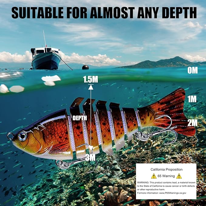 - Lifelike Shape: The freely moving joints and realistic eyes make this bass bait more attractive, swimbait fishing lures can reflect external light at all angles and has the effect of light attracting fish, which is suitable for different water conditions