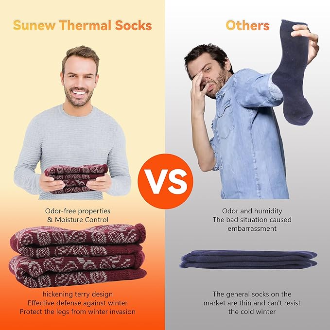 - Ultra-Comfy for Sweaty Feet: Worried about sweaty feet? Our warm socks for men boast a moisture-wicking material that pulls sweat away from the skin to keep your feet dry all day.These heated socks are designed with moisture wicking material that keeps our feet dry and warm, reduces odor and maintains comfort throughout the day. Winter socks are daily necessity for every family and our long warm socks are good choices for winter extreme cold weather.