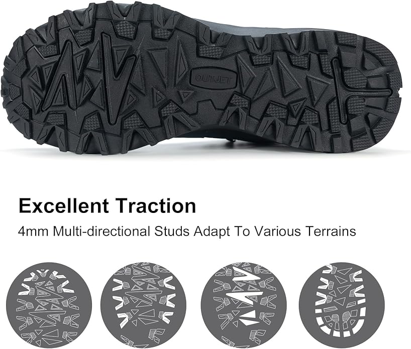 - Anti-slip Grip: The outsole is made of high-quality rubber, which is wear-resistant and non-slip; Ergonomic rubber lugs ensure sufficient traction and anti-slip performance on various terrains;