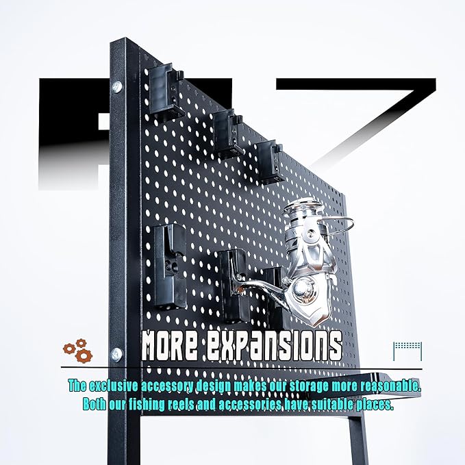 - 1. Big Storage, Zero Clutter Stop juggling rods, reels, and tackle boxes like a circus act. With 3 large tiers and room for up to 12 rods, you’ll finally have space to breathe. Perfect for taming your chaotic garage or prepping for a weekend fishing trip. Three roomy shelves, six hooks, and a rod holder system keep everything in check.