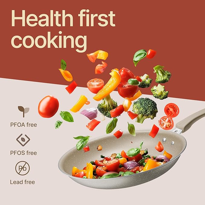 - NONSTICK COOKWARE SET – Crafted with PFOS and PFOA-free materials with non stick coating that’s safer for health and 10x more nonstick, ensuring easy food release and cleanup. Though dishwasher safe, handwashing is recommended to maintain its premium quality.