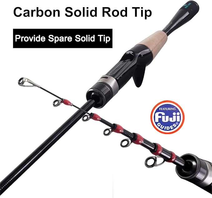 - Provide Spare Solid Tip - All models telescopic casting and spinning fishing rod feature a carbon solid rod tip for enhanced sensitivity, enabling delicate bait manipulation and maximum bite detection. Even when fish are less active in low water temperatures, the precise rod tip control gives you better chances of success. In addition, we also provide a spare solid tip that can be replaced immediately in case of accidents during fishing.