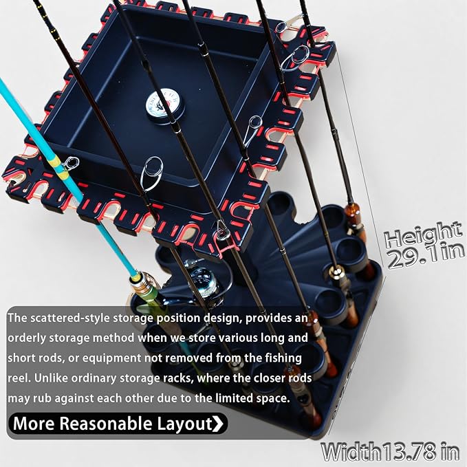 - Ingenious Space-Saving Design The clever staggered cross-layer layout stores up to 24 rods in a compact 13.78″ × 13.78″ footprint—great for tight corners or busy gear rooms
