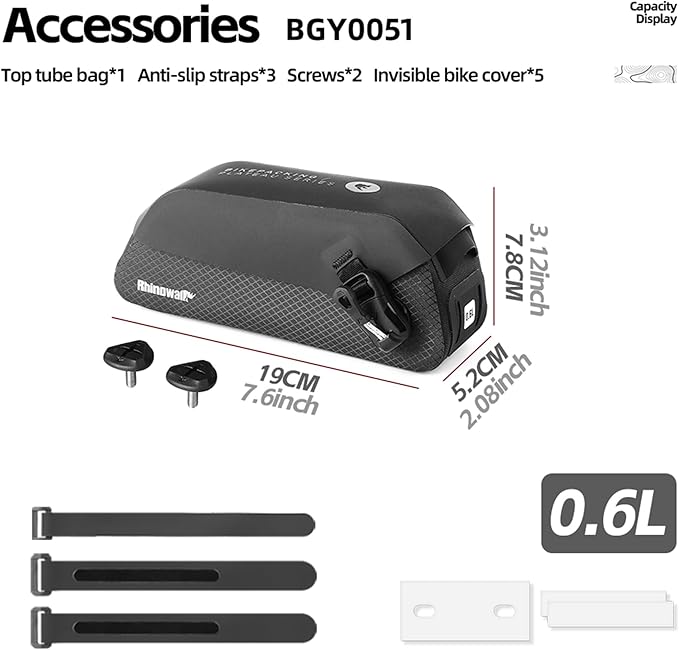 - Size & Contents: Size: 7.6×2.08×3.12 in. Capacity: 0.6L Weight: 144g/0.32lb. Includes bag×1, straps×3, screws×2, covers×5