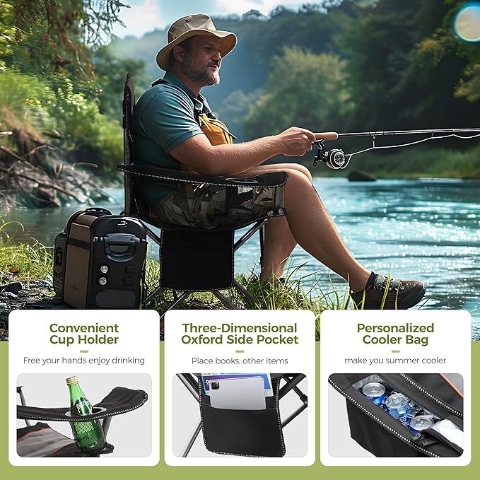 ALPHA CAMP Oversized Camping Chair Heavy Duty Lawn Chair with Cooler Bag Support 450 LBS Steel Frame Collapsible Padded Arm Quad Lumbar Back Folding Chair for Lawn Outdoor