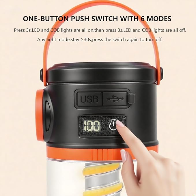 - Dual-Light Camping Lantern:Equipped with two types of lights:LED far light and COB near light.The LED far light can precisely illuminate a designated area,the COB near light can illuminate the nearby area,suitable for outdoor camping,emergency lighting,applicable for emergency lighting in households,outdoor fishing,hiking,night cycling,car maintenance and dog walking.