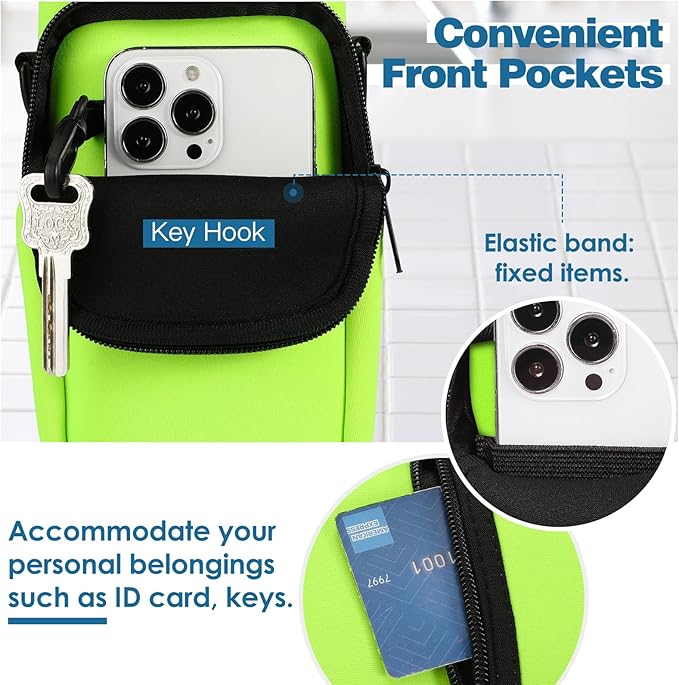 - 2 POCKETS: The small zipper pocket is for cash and card, the large zipper pocket is for smartphone, keys, and other essentials. When you go out, you just need to bring this water bottle bag, no need to carry the bag to hold these small items.